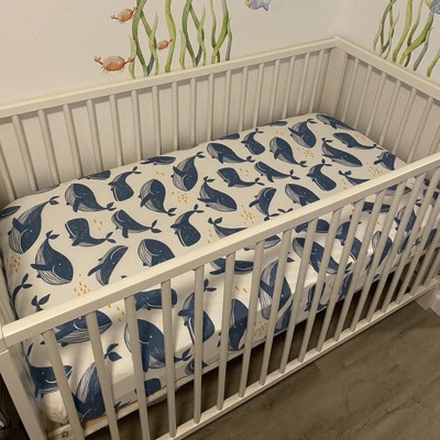 - Includes 1 aqua blue and 1 blue whale-print crib sheet