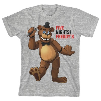 Get ready for Freddy with this FIve Nights at Freddy's tee. The shirt features Freddy Fazbear holding a microphone and tipping his hat in front of a checkered circle while black letters below spell out the video game's title. The tee comes in a charcoal short sleeve crew neck and makes a great gift for young fans of the Five Nights at Freddy's video game series.