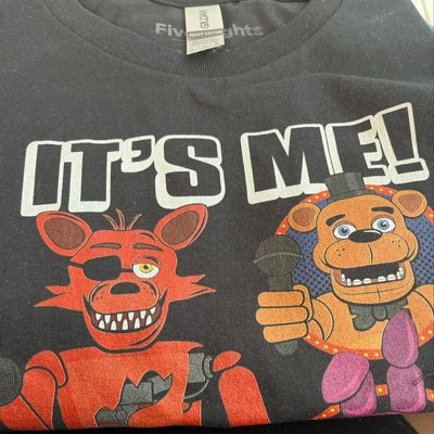 • GRAPHIC TEE: This shirt features a full figure of the Foxy animatronic with Freddy, Chica, and Bonnie appearing in circles next to him. Black letters outlined in white at the top of the tee read, "It's me!" This tee makes a great gift for FNAF fans.