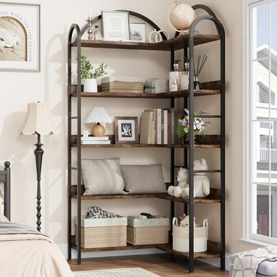 Five-tier L-shaped corner bookshelf with wood and metal storage shelves. Space-saving office display unit suitable for living rooms and bedrooms.