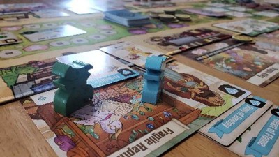 Flamecraft is adorable and incredibly easy to play. You are given a card that tells you exactly what to do and in what order every turn. The fun comes from when you start moving dragon cards around the town. At the start of the game the town that serves as the main board makes sense. The butcher shop gives you meat and so on, but as the game progresses, you'll be moving cards off of these shops and onto others. So now the butcher might give you meat, gems, and leaves. Every shop has a witty name and great artwork!