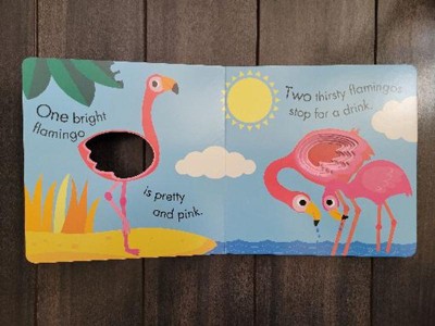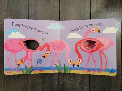 Learn to count with My Little World! Each sturdy board page features an interactive finger-hole for little hands to manipulate as they turn the page. Bright, bold colors and simple scenes follow a flock of flamingoes spending a warm, sunny day standing in the cool water, searching for lunch, flying through the sky, watching the other animals, and then finally yawning and snuggling up for a good night's sleep. The finger-holes decrease in size with each turn of the page, which adds to the fun.