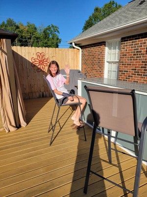 [This review was collected as part of a promotion.] We have been looking for bar stools for our outdoor bar. And finally found the ones that are perfect. These chairs are the perfect height for the bar top. They are extremely comfortable and the arms are perfect to relax and sit back. I love the bar on the front, so you can put your feet there for stability and just chill out. I recommend tilting them forward if you are gonna get rain. Because the seat does paddle up with water. We left them out there on purpose standing because I wanted to see how the water rolled off of it after the storm and it did an amazing job with no staining at all. These chairs are definitely worth the price. I would highly recommend this, even if you're on the fence, give them a try, you won't be sorry.