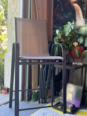 Furnish your outdoor space with this patio bar stool that coordinates well with our glass bar height metal patio bar table. Use this barstool with back as additional outdoor seating around your deck and patio when you have gatherings. As an added bonus these patio stools blend in almost any decor. The patio dining stool is very comfortable in a textilene upholstery that is breathable to keep you cool during the hot summer months. The sling style stool with footrest provides a comfortable resting place for your feet, while the arms relieve pressure from your upper body. Place these patio stools around your outdoor bar while you wait for a drink or the food to come off the grill. Whether you have a backyard with a pool or green space these outdoor barstools will add attractive seating for your family and guests to enjoy. Additional Features: Plastic Floor Glides protect floors when used indoors, Patio stool for sunroom, garden, porch, deck, or poolside seating, Pair with our Glass Bar Height Metal Patio Bar Table