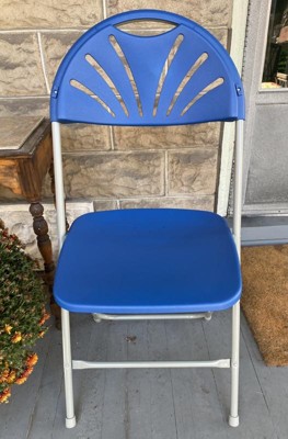 [This review was collected as part of a promotion.] The HERCULES Series 650 lb. Capacity Blue Plastic Fan Back Folding Chair is an indoor/outdoor seating solution that is nicer than some of the furniture in my house! This beautifully constructed folding chair has a refined design that belies its strength. Yes, a person of 650 pounds really can sit in it safely, but it doesn’t seem oversized or cumbersome. It folds so flat, storage of even a lot of these chairs would be a breeze. I’d love to use these chairs at an outdoor event; they’re nice enough to be used for seating at a garden wedding! There is nothing rickety or flimsy about the Hercules. I appreciate the solid construction as well as the rich royal blue color of the seat and the subtle dove gray of the metal. And my favorite detail: three unobtrusive drain holes in case it rains! The chairs will dry in no time. This is the highest quality folding chair I have ever seen, and I give it my absolute highest recommendation for any use, indoor or outdoor.