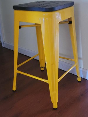 [This review was collected as part of a promotion.] I really like this red Flash Furniture Stool. It is a nice bright red color. The wooden top adds to the look of the stool so it is not just plain. The wooden top is easy to install and sits nicely on top. It is not soft so a cushion can be placed on top if desired. This can be used in so many areas. I am glad I got it.