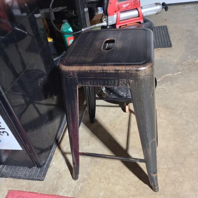 Save on space with this Backless Metal Bar Stool with wood seat. The clean lines and simple design of this square, industrial style stool will look great in your kitchen or inside your bar/restaurant. Designed to stack, this stool is an ideal choice in the restaurant industry. A cross brace underneath the seat adds extra stability and features plastic caps that prevent the finish from scratching when stacked. The lower support brace doubles as a footrest, and floor glides protect your floor by sliding smoothly when moving it. Designed for both commercial and residential use, this bar height stool will provide refreshing rustic feel with its metal and wood features. Additional Features: Galvanized Steel Black Powder Coated Frame Finish, Footrest promotes better sitting experience, Floor Glides protect floors from scratches, Designed for Indoor Use Only, Metal Stack Stool for kitchen, dining room, bar, restaurant or game room