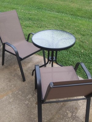 [This review was collected as part of a promotion.] Brazos has come out with a 3 pc patio set that not only looks really nice, but it's really sturdy. The mesh on the chairs it nice and tight. Hardly any give when you set. The frame of the chair is extremely well built. It's very strong. The table is the perfect size for 2 people. The glass is snug in the table frame. This is a set that isn't going to blow across your patio with some wind. Just a really nice set!