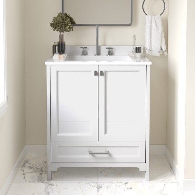 [This review was collected as part of a promotion.] This is an absolute beautiful vanity sink combo. I love that it comes preassembled and that all I had to do was switch the door pulls. It also contains a portion on the back that can be used as a splashguard. The marble is stunning and goes perfectly with my bathroom to me. The style looks a little farmhouse, but that’s exactly what I was looking for. Ample storage as well with space on the bottom for rolled up towels.