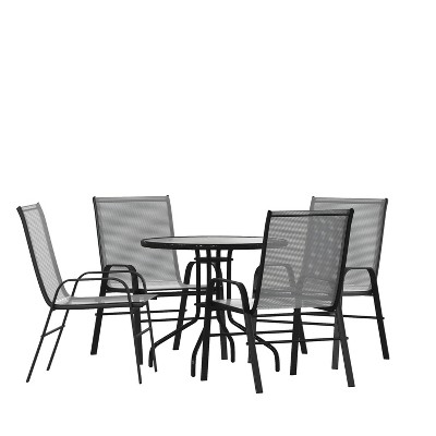 Entertaining outdoors can be relaxed or elegant depending on your occasion so don't put off furnishing the outdoor space at your home or business any longer. This 5 piece patio table set for 4 boasts a square outdoor glass table with a designer rippled look, but is smooth to the touch to keep items level. Ergonomic sling design patio chairs with curved arms not only look great, they feature breathable, black flex comfort material to keep you cool during the hot summer days. Serve meals outside for a change of pace with no worries. This outdoor patio table boasts a solid steel, powder coated frame that will hold up to 130 Lbs. weight capacity and the outdoor patio chairs will hold up to 350 pounds to accommodate most users. The weather-resistant frames are designed to be enjoyed no matter the season. For longevity, care should be taken to protect from long periods of wet weather. Lightweight and stackable, the commercial grade patio chairs can be stacked up to 4 chairs high to store or clean your outdoor dining space. Arrange your perfect outdoor setting on the patio or balcony with this modern outdoor patio dining set that's meant to be enjoyed year-round. Additional Features: Four Stackable Breathable Textilene Fabric Upholstered Sling Patio Chairs, Curved Arms provide support to upper body, Plastic Floor Glides protect floors when used indoors, Outdoor dining set ideal for your eatery, bistro, deck patio or sunroom.