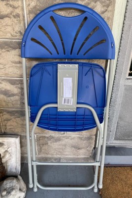 [This review was collected as part of a promotion.] The HERCULES Series 650 lb. Capacity Blue Plastic Fan Back Folding Chair is an indoor/outdoor seating solution that is nicer than some of the furniture in my house! This beautifully constructed folding chair has a refined design that belies its strength. Yes, a person of 650 pounds really can sit in it safely, but it doesn’t seem oversized or cumbersome. It folds so flat, storage of even a lot of these chairs would be a breeze. I’d love to use these chairs at an outdoor event; they’re nice enough to be used for seating at a garden wedding! There is nothing rickety or flimsy about the Hercules. I appreciate the solid construction as well as the rich royal blue color of the seat and the subtle dove gray of the metal. And my favorite detail: three unobtrusive drain holes in case it rains! The chairs will dry in no time. This is the highest quality folding chair I have ever seen, and I give it my absolute highest recommendation for any use, indoor or outdoor.
