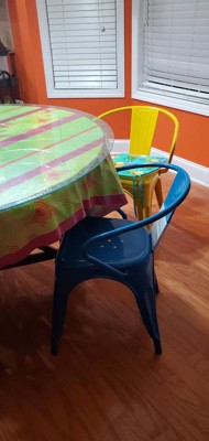 I bought 6 of these chairs, orange, green,yellow,blue,red and white all metal ,all Bistro style. I couldn't be happier, not only are they pretty but durable and comfortable. I put them around a wood wire spool table 48' outside under a pergula. PERFECT A GREAT DEAL, Quality product will last, NO Doubt!