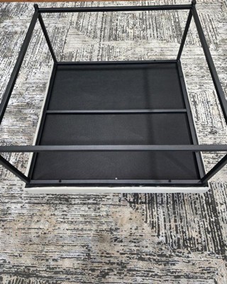 [This review was collected as part of a promotion.] Leather top with metal frame. Super easy to put together- all tools and screws came provided with product. Leather top was wrapped up nicely and not damaged. Great living room piece!