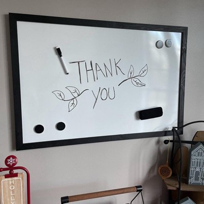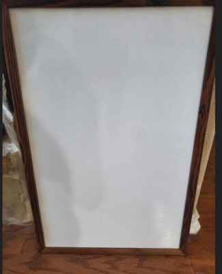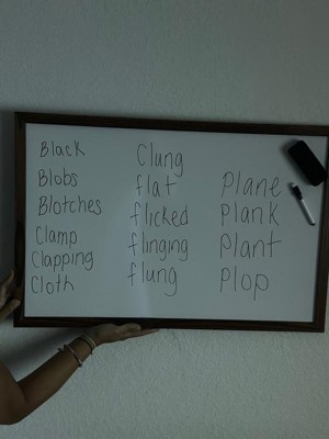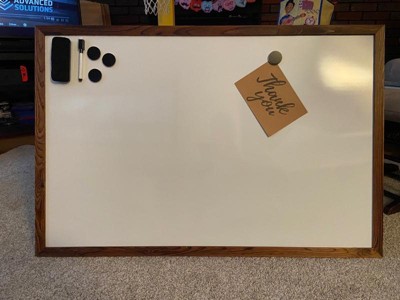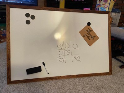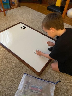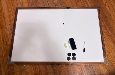 [This review was collected as part of a promotion.] Who doesn’t love a good white board when they have little ones around. Now add the brown wood around and make it fit into your decor. Obsessed with this. Comes with eraser, marker and magnets. Spelling words will be a hit on this board.