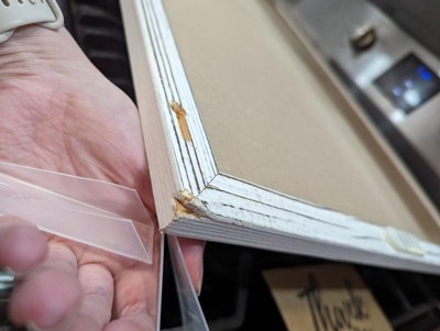 [This review was collected as part of a promotion.] Even though this white board was shipped with plastic protective corners one of my corners still arrived busted and the wood design is kind of ugly, sort of dirty looking and even somewhat pixely. The magnets included are very cheap looking, just black cardboard circles. With all that being said, it is quite useful and I did appreciate that it included screws and a level for installation. Looks pretty good from far away, just not so much up close.