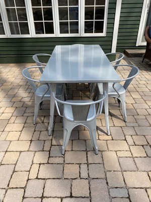 The indoor-outdoor rectangular metal table with six arm chairs will give your dining room or restaurant a cool retro-vintage look. The table top measures 31.5 inches wide by 63 inches long and has a smooth top with a 1 inch edge. A stabilizing brace underneath the top gives this table increased stability while still allowing ample leg room. The cafe style arm chairs feature curved backs with a vertical slat, integrated arms, and a cross brace under the seat for added support and stability. Plastic bumpers on the cross brace protect the finish when stacking them. Drain holes in the center of the seat allow water to drain, preventing rust. A smooth, powder coat finish protects the set from scratches and floor glides protect your floors when you need to move it. Designed for both commercial and residential use, this trendy table set will create a lasting impression whether you're serving customers or playing cards with friends. Additional Features: Curved Back with Vertical Slat, Integrated Arms, Drain Holes in Seat, Cross Brace under seat provides extra stability, Plastic Caps on cross brace protect finish when stacked