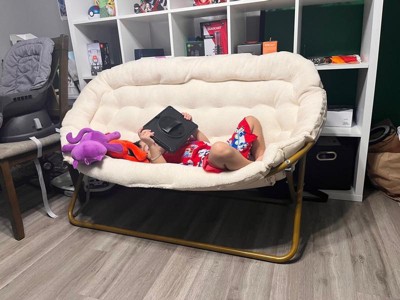 [This review was collected as part of a promotion.] This double saucer folding chair is amazing! The fabric is super cozy and soft with enough padding to make it a great lounger. The frame is very strong and built to last. It has a nice gold finish which I think gives it a high end look. It was very easy to unfold, and then refold. I love how easy it is to store too. Would fit under a bed if needed to be tucked away. I would highly recommend this double saucer!