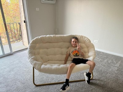 [This review was collected as part of a promotion.] My son and I just LOVE this chair! This chair is very comfortable and perfect for two people. The assembly was pretty easy and quick. You just extend the chair and make sure the legs pop into the holes. And I love the fact this chair is white with gold accents 🫶🏼