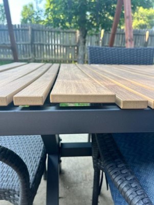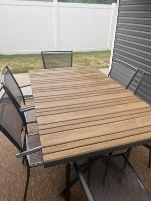 [This review was collected as part of a promotion.] The table is adorned with gray faux teak (made of poly resin) slats that shouldn't rot, peel or chip even when exposed to the weather. It has a gray (rust-resistant) metal x-ahaped frame and the material is great for use throughout any seaaon. It will seat up to 6 people. It didn't take me long to assemble the table. I love that its simple to clean, as you just wipe clean with a damp cloth. I love my new patio dining space!!