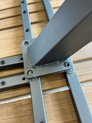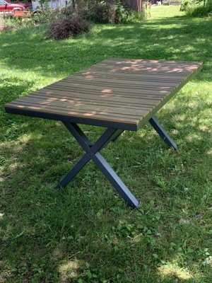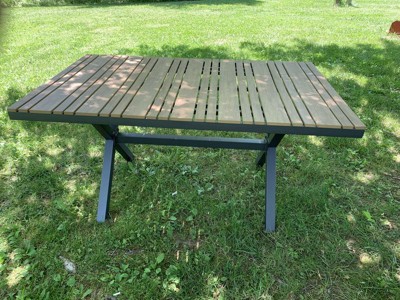 [This review was collected as part of a promotion.] I like that this is rust resistant and has a sturdy metal frame. It is lightweight considering it's welded metal. It looks nice from afar. I am not sure where the "10 minute set up" cleaim came from. This took over an hour to put together. The welded metal frame seems poorly constructed, as if it wasn't measured correctly. The angles were all off, meaning none of the screw holes matched up, as seem by the attached pictures. The entire frame was 17 degrees off and thanks to my husband being a welder, he was able to fix it. The slats on the table are another issue. As seen in the picture in the heat and the cooler weather they warp continuously throughout the day. It's as if they should be screwed down to the end of the frame also and not just in the middle. I am glad I didn't get rid of my previous patio table, as this one will just be used as a buffet table and not the main dining table due to the defects.