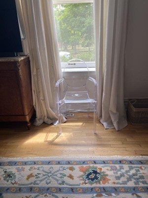 If you love to move your furniture around with the change of seasons, or just the change in your mood, then this ghost chair with arms is a great choice. The transparent ghost chair brings fluid design, elegance and function to your home, restaurant and special events. This modern chair with its Louis XVI styling and near invisibility won't get in the way of your artwork and other furniture pieces, lightens a crowded space and can make a small room appear larger. Curved arms and a contoured seat make this chair comfortable and its polycarbonate molded structure makes it shock, scratch and water resistant. Protective floor glides protect your floor by sliding smoothly when you need to move these beautiful chairs. Designed for indoor-outdoor and commercial use, the understated ghost chair is a classic accent chair that highlights almost any decor without blocking the view.