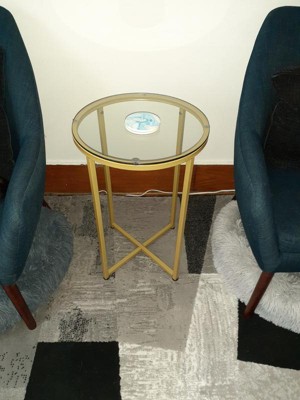 [This review was collected as part of a promotion.] This is a beautiful, modern end table. It is the perfect size to put next to a chair. It is tall enough I don't feel like I am reaching down to put something on it. The glass is thick and sturdy. The base is a matte gold and is also sturdy and holds the glass well. The gold is much more gold in color than the picture shows. It's a brighter gold. It took maybe 20 minutes, if that, to put this together. It was quick and easy. Everything needed is included. The suction cups that hold the top on hang over the edge so it doesn't look as nice as it could. It still holds the glass in place just fine but I feel like the suction cups either need to be smaller or the top of the base needs to be slightly wider to fit the suction cups properly. It is still a really nice table and exactly what I needed for my space.