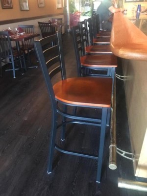 Create a first-rate dining experience by offering your patrons great food, service and attractive furnishings. Commercial furniture needs to be both durable and low maintenance so metal barstools are a popular choice for furnishing restaurants, pool halls, lounges, bars and other high traffic establishments. This stool is easy to clean, which is an important aspect when it comes to a business. Built to withstand the everyday hustle and bustle in the restaurant and hospitality business, these dining stools will also look great in your home. The beautiful wood seat and ladder back design will keep guests comfortable. The frame is stabilized using two welded support bars, which includes a footrest to prevent leg discomfort. The floor glides help protect your floors and ensure smooth gliding. Use this bar height stool in your kitchen, dining room or home bar and give your decor a fresh look. The simple and lightweight design of this stool will not disappoint, whether used in the home or your commercial business. Additional Features: Footrest promotes better sitting experience, 18 Gauge Steel Frame Powder Coated Frame Finish, Floor Protector Plastic Glides, Designed for Commercial Use; Suitable for Home Use, Multi-use: kitchen dining chair, restaurant chair, side chair, café chair, bistro chair