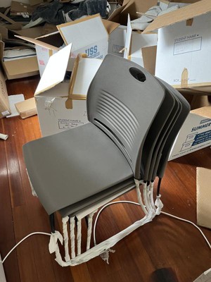 Excited to receive this awesome set of 5 stacking chairs for our dining room. No assembly required. Only needed to remove the protective covering. The design and look are modern and clean. They work perfectly with our dining table and we even have an extra chair for our living space. The chairs are very comfortable and durable. They are easy to move to use for additional seating in our living room when we have company.