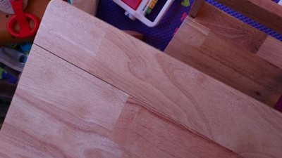 I bought this for my 14month old grandson for Christmas. I tight being made of solid hardwood it would last for years. After only 2 months, several large cracks have formed where the butcher block prices are glued together. This has caused the legs to wobble. I expect this rable will break completely soon. Very disappointing for the price.