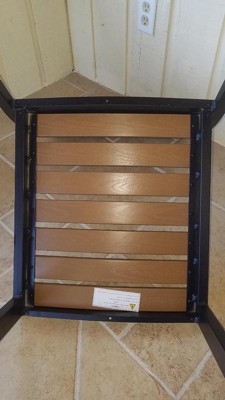 Create the perfect space for relaxing evenings and great conversations with this faux teak outdoor patio chair. This comfy patio chair boasts a slatted poly back and seat and lightweight aluminum frame capable of holding up to 300 lbs. weight capacity to accommodate most visitors. This patio dining chair is weather and rust resistant so you won't need to move it or put it away when the seasons change and is stackable up to 8 high. Best of all, this chair comes fully assembled so you can start enjoying it as soon as you receive it. Create a sophisticated look for your outdoor space with this slatted patio chair that pairs nicely with our outdoor table with faux teak poly slats. Fixed plastic floor glides will allow ease of movement and spills clean up easily with a water based cleaner making this chair very low maintenance. Reduce stress and make the most of your evenings and weekends with this patio dining chair that is sure to become your go-to seat.