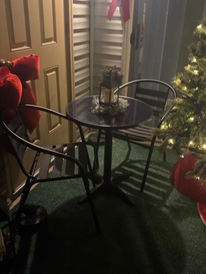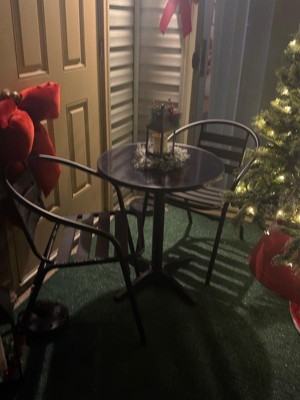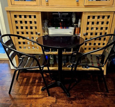 [This review was collected as part of a promotion.] My partner and I have been thinking about getting a small table chair set for the front patio for some time. When this came along, I decided to get it. The table arrived in one box, the chairs in another. The chairs were nicely sleeved and stacked, so there was no metal on metal scraping. The table was interesting to put together. The instructions in the box were for a different table. Thus I had to figure out the assemblage on my own. It was not that bad. The set looks great. The table sits flat with no wobbling or looseness. The chairs look fabulous. We only had a few days of usage, then we disassembled the table and moved everything into storage for the winter. I can not wait to bring it out for the warmer months.