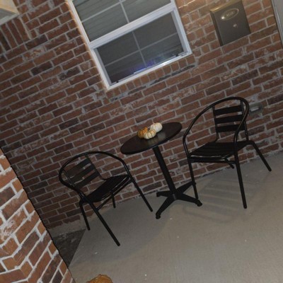 [This review was collected as part of a promotion.] This is quite a neat, simple set of two chairs with a nice round aluminum table to accommodate with. The set can be kept inside, or outside, whichever you prefer. I have mine on my back deck, and enjoy sitting in the chairs, while using the table to hold my food and drink.