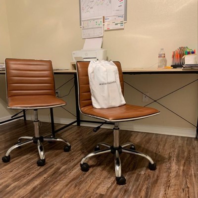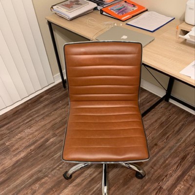 Modern accents and a sleek profile make this ribbed office task chair a perfect addition to your board room, business, or home office. A streamlined silhouette combined with the armless design can breathe new life into a small workspace and not only allows room for more board members, clients or visitors but also permits you to roll further under a desk or table to get closer to your monitor or paperwork preventing back strain. The glossy brown vinyl upholstery with a chrome metal border paired with a matching chrome frame and base gives an up-market feel to any professional space. When you spend the majority of your day at your computer, comfort is key. The low back design and foam molded seat and back provide lower back support for those who do a lot of typing. A pneumatic seat height adjustment lever lets you easily position the chair where you need it while the 360° swivel gives you access to all of your work surfaces with minimal effort. This sturdy task chair has a heavy duty, 5-star chrome base with dual-wheel casters for effortless mobility. Spills clean up easily with water followed by a dry cloth. Whether you work from home or go into the office, this designer armless task chair is a great choice for any workspace. Additional Features: 360 Degree Swivel Seat allows you to reach multiple work surfaces, 5-Star Chrome Base with Dual-Wheel Casters provide smooth movement, Cleans Easily with water and a dry cloth, Low back task chair blends easily into any home or work environment from the conference room to your living room