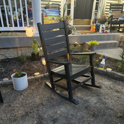[This review was collected as part of a promotion.] This rocking chair was just what I was looking for. I wanted a light comfortable chair for my front porch. This black rocking chair matching perfectly with my other furniture and rocks my worries away