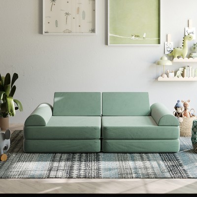 [This review was collected as part of a promotion.] It comes compacted in a box and took a little over 48 hours to fully take shape. This modular couch set is adorable in the sage color. My son and nephews love playing with it and building forts and tents. I like that it’s stackable so when they’re not playing with it, it’s easy to store. The material is soft to the touch but still feels sturdy and firm. I would recommend this, esp if you’d rather have the kids build forts with this instead of your actual furniture. The cushions have zippered covers that make them easy to remove and wash.