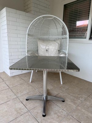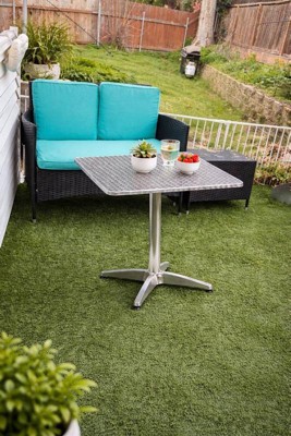[This review was collected as part of a promotion.] A heavy and stable with a solid weighted base and metal build that holds up well both indoor and outdoors. The table 31.5” square top — not too big to overwhelm a balcony or small patio but roomy enough for meals and drinks (about four chairs around).