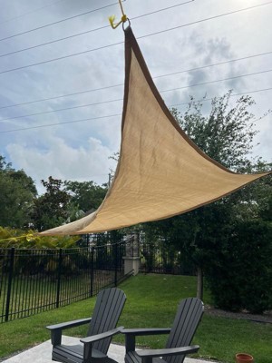 [This review was collected as part of a promotion.] It’s much harder to set up a triangle sunshade than you might imagine. I didn’t realize how difficult it would be to make sure everything was taut. I ended up anchoring a part of it to my fence, which isn’t ideal. That’s a me problem though. The sunshade its self is very nice. It does a good job of keeping the sun off my patio. I found that the easiest way to tie off the ropes (the included ropes are black but my dog decided to eat them, hence the yellow rope in the pictures) is with a simple anchor hitch. I attached carabiners to one end to make it easy to put up and take down on the future. All in all, it’s a nice shade if you have the space.