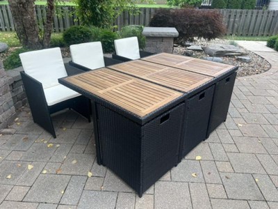 Flash Furniture Peregrine 7 Piece Outdoor Patio Dining Set, Space Saving Black Wicker Modular Chairs-Cream Cushions & Natural Acacia Wood Table Top