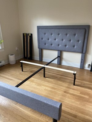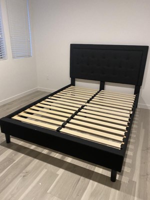 Retreat in style with this modern, low profile platform bed with button tufting and embedded outline designed headboard. This upholstered bed frame has just enough character to enhance the look in your bedroom. The low frame will keep the bedroom feeling open and allow easy access to making up your bed. The frame features a center support leg and 15 wooden slats that are designed to support your mattress without the use of a box spring. Purchase a pocket spring mattress to complete your bed and prepare for a wonderful night's rest.