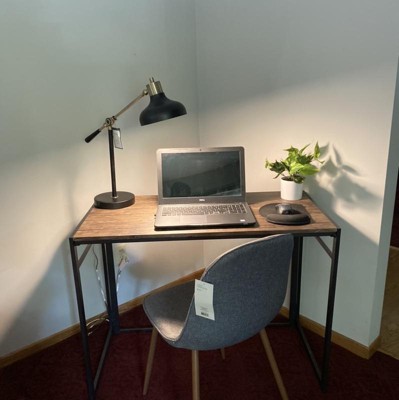 Get into a normal work from home routine by setting up a dedicated office space to perform your work duties instead of the dining room table. When you need something simple and functional this folding computer desk is at your service. Setup your desktop or use as a laptop table. If you're short on space this foldable desk folds to 2.25" depth to store behind your sofa. Create a school environment at home for your remote learning student. This student desk can be used in the home or dorm room. No assembly required to get you working faster. The industrial style desk can be your all-in-one creative space for work, play and meals. Additional Features: Space-Saving Design: setup anywhere around the home and fold when not in use, Ready-To-Use - No Assembly Required - Unfold frame and snap desktop into place, Setup your work from home office or student desk with this foldable desk
