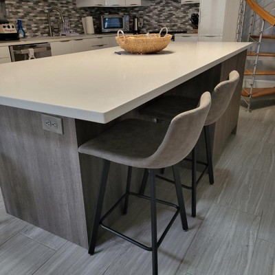 [This review was collected as part of a promotion.] I was very pleased when I received these two counter height stools as the grey faux suede is the perfect color for my kitchen island. The chairs were very well packed and had no damage or scratches. Putting them together was fairly easy with the picture instructions. The legs were marked left and right but what was missing was which legs were to be installed to the front of the chair. That would have been a valuable piece of information to have included on the legs as the picture was not clear. It took a while to figure out which legs went to the front and which legs went to the front of the seat. Other than that, installation was easy. The chairs fit under my island overhand which is good as I did not want there to be a break in the site line as I have an open kitchen/living space. The chairs are comfortable but I wish the backs were a little higher to provide a better back support. But then maybe that would have interfered with the site line.