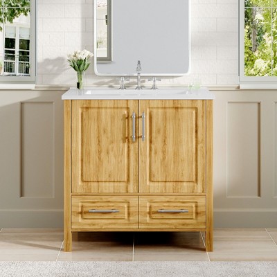 [This review was collected as part of a promotion.] This 30” bathroom vanity is a simple design with classic lines. With double doors with self close and quiet close. Nice Carrara marble top with an optional back stop is ready for your own faucet set. Came fully assembled with leveling legs makes for an easy installation. Very happy with quality and the classic look .