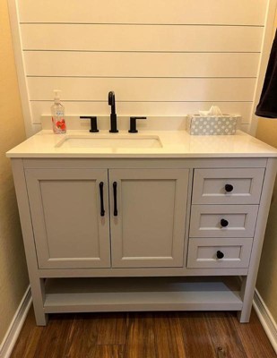 [This review was collected as part of a promotion.] This was the perfect vanity for our modern hall bathroom remodel. The color is the perfect light grey and seamlessly compliments the other black/white elements we added to the bathroom. I love that it came with the top and it’s a super high-quality piece. I’m so happy with it!
