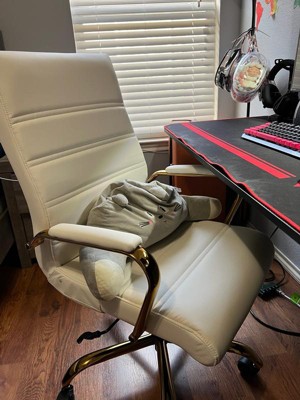 [This review was collected as part of a promotion.] So far, this high-back executive swivel chair from Flash Furniture has been incredibly comfortable for my home office. This chair can fit small to medium space. It is simple to sit for extended periods of time without experiencing back pain thanks to the supportive yet soft cushions. Because it offers outstanding neck and upper back support, I truly enjoy the high back design. It enhances my workstation with its sleek, contemporary appearance thanks to the metal frame and gold embellishments. It was easy to assemble and took little time. The chair feels solid and sturdy and it rolls and swivels smoothly. All things considered, it's a fashionable, cozy chair that's ideal for everyday work and study arrangements.