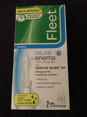 Clean the bowels and relieve pain with a Fleet ready-to-use laxative enema. This enema guarantees relief from constipation with no irritation or spasms. Inside the 4.5-ounce constipation-relieving enema is 19 grams of monobasic sodium phosphate and 7 grams of dibasic sodium phosphate. This enema works to add more water into your intestines so that the stool inside softens and you can have a bowel movement. Fleet's ready-to-use enema is also ideal for bowel cleansing before having a colonoscopy or other medical exam involving the bowels. Users can use this enema to evacuate stool with two recommended positions: the left-side position or the knee-chest position, giving you options for how to rest on your bed or other surface. Included with this laxative saline enema is a lubricated gel glide tip to ensure better comfort and simplicity. This enema serves as a quicker alternative to oral and liquid laxatives.