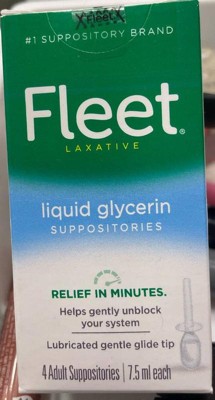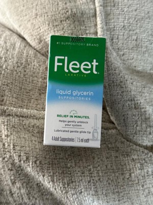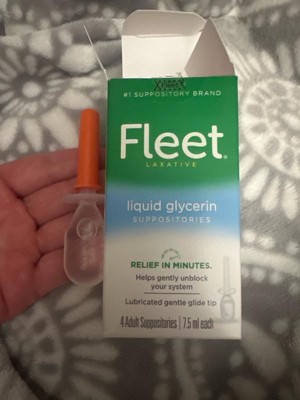 - Contains 1 pack of Fleet Laxatives Liquid Glycerin Suppositories, 4 bottles, 7.5 mL each