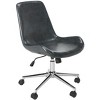 This contemporary swivel office chair is a stylish and functional piece that effortlessly blends vintage charm with modern aesthetics. Its durable faux dark grey leather upholstery offers a luxurious and inviting seating experience, while its sleek chrome legs ensure both style and functionality. The chair's perfect combination of comfort and versatility makes it the ideal choice for those who seek a touch of classic elegance in their workspace. With its timeless design and exceptional quality, this swivel office chair is sure to enhance your productivity and elevate your overall well-being.