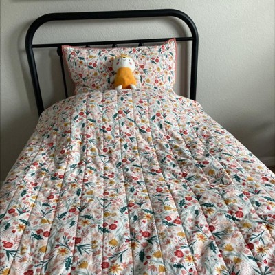 Refresh your kiddo's bedding with the Floral Cotton Sham from Pillowfort™. This pillow sham is adorned with a vibrant floral print set against a white background, which reverses to a solid base in pretty coral gala for a cheerful look. The seamless channel quilt pattern provides this printed sham with textural depth and dimension, while the soft pink edging complements the pink bottom for added appeal. This decorative pillow sham has a six-inch envelope closure to keep the pillow insert tucked in with a neat finish, while still allowing easy removal for cleaning. Plus, the sham is machine-washable for easy care and maintenance.