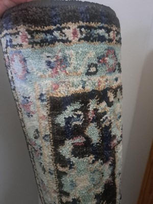 This seems like a nice sturdy rug. The pattern on the rug is a bit odd to me. It reminds me of ink blots. I'm not a fan of the color scheme either. The darker boarders just don't flow with the pale blue throughout the rug.