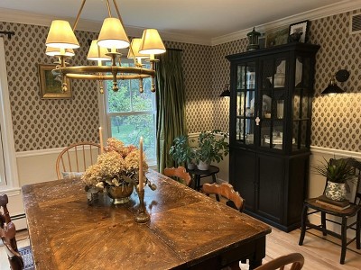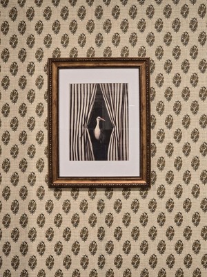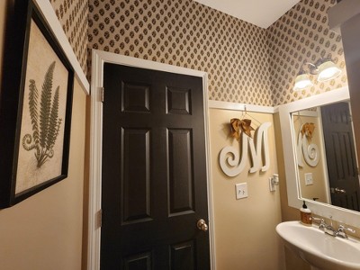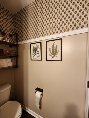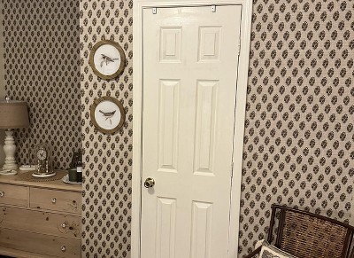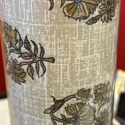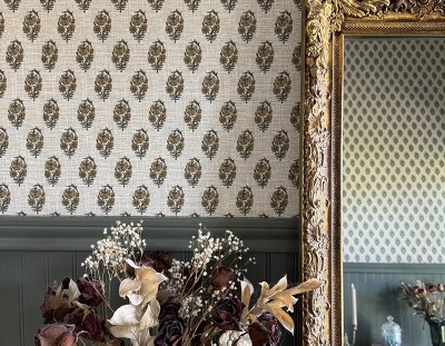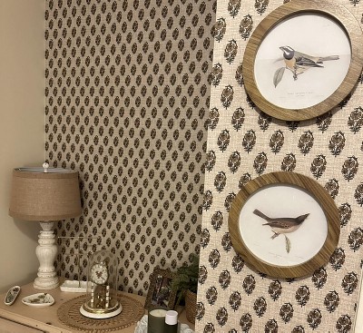 A: The wallpaper features a beautiful floral stamp pattern on a wheat-hued backdrop.